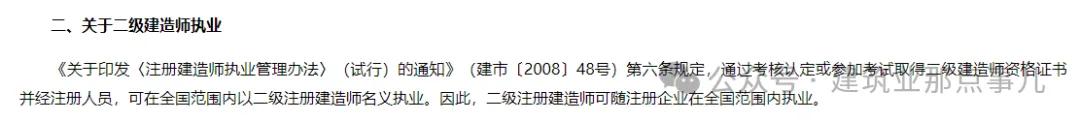 住建部办公厅曾发布关于二级建造师跨地区执业的复函,明确二级建造师可随注册企业在全国范围内执业。